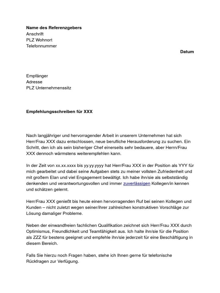 Beispiel Fur Empfehlungsschreiben Muster Kostenlose Vorlage